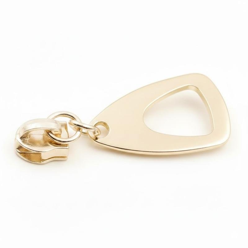 This zipper puller slider is crafted from durable zinc alloy with a golden plated finish. Featuring a non‑lock design, it ensures smooth functionality for garments and fashion accessories. Nickel‑free and washable, it combines durability with stylish appeal, making it a versatile choice for clothing applications.